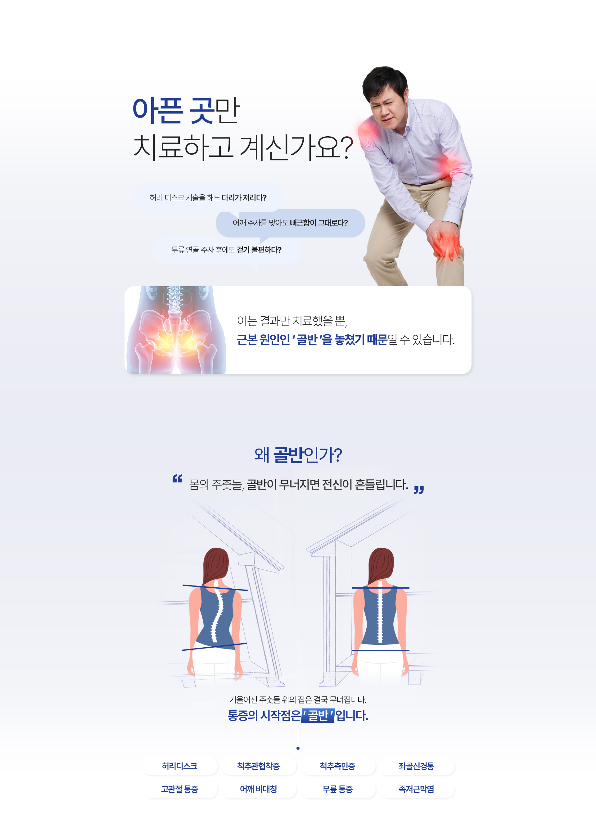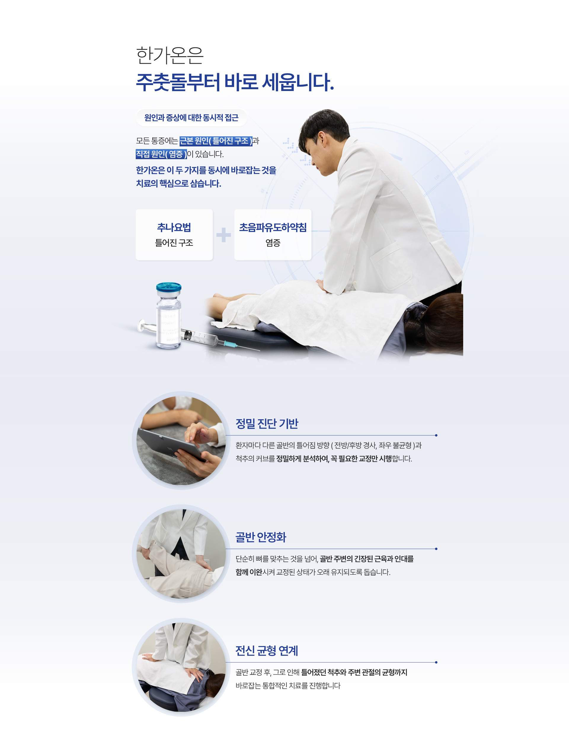 골반은 척추를 잡아주는 기둥이고 체중을 다리에 전달하는 중심입니다. 골반의 문제는 신체 불균형을 가져오고 관절에도 영향을 줍니다. 한가온은 신체 밸런스를 교정하고 원인과 통증을 잡는 치료법을 제시합니다.