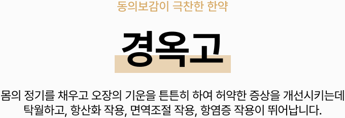 녹용은 재생력과 면역력을 강화시켜 쇠해진 몸의 기운을 북돋아줍니다.