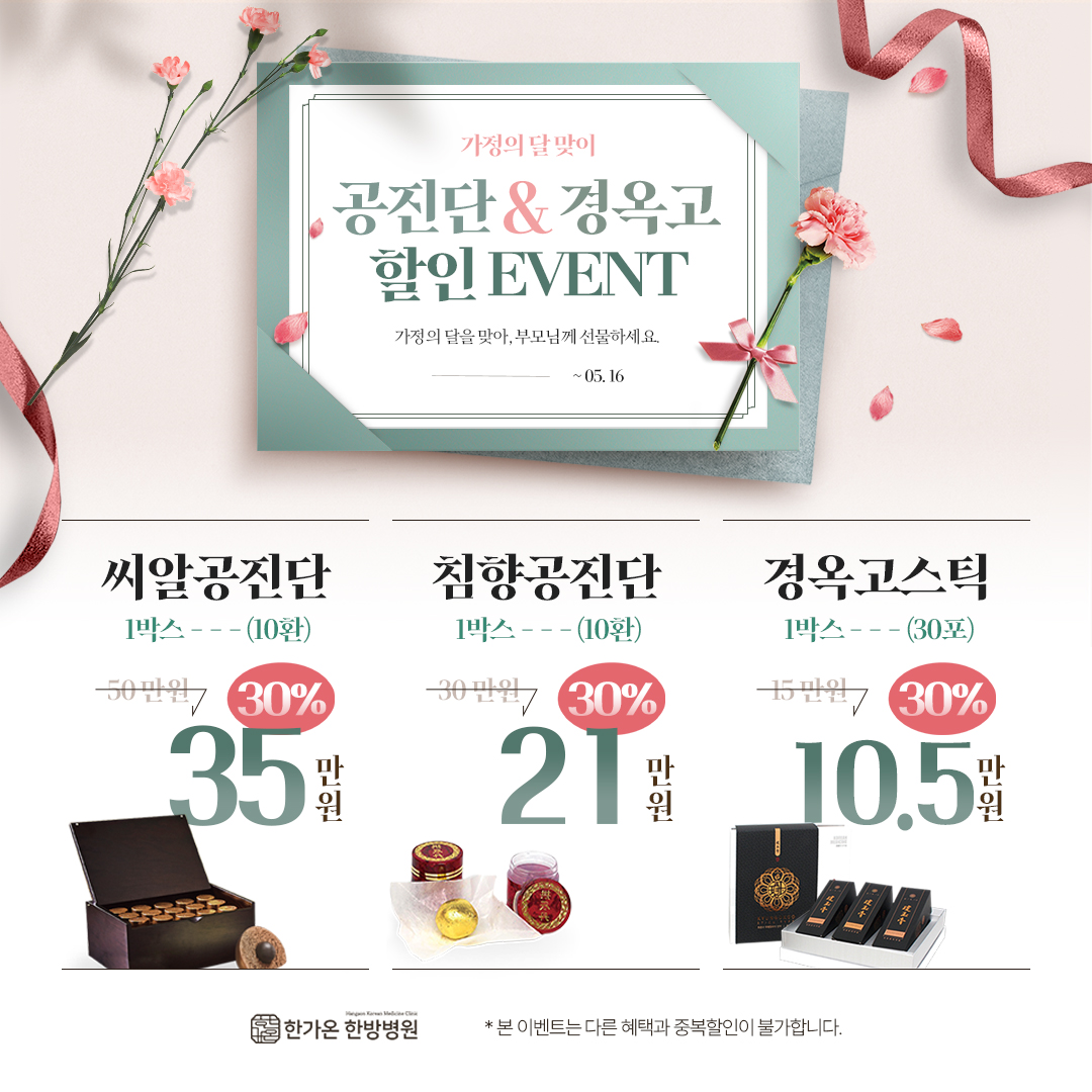 공진단 & 경옥고 30% 할인🎊 페이지 정보 강릉점 | 작성일 2025-04-29 | 조회수 550 본문 🎁 가정의 달 건강 선물 이벤트 🎁 소중한 분의 건강을 위한 마음, 정성으로 전하세요. ✅ 씨알(사향)공진단 ✅ 침향공진단 ✅ 경옥고스틱 👉 전 품목 30% 할인! 📅 이벤트 기간: ~ 5월 16일까지