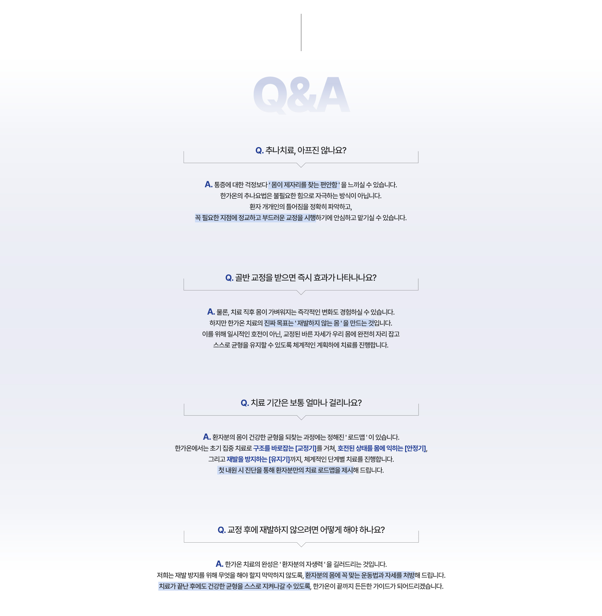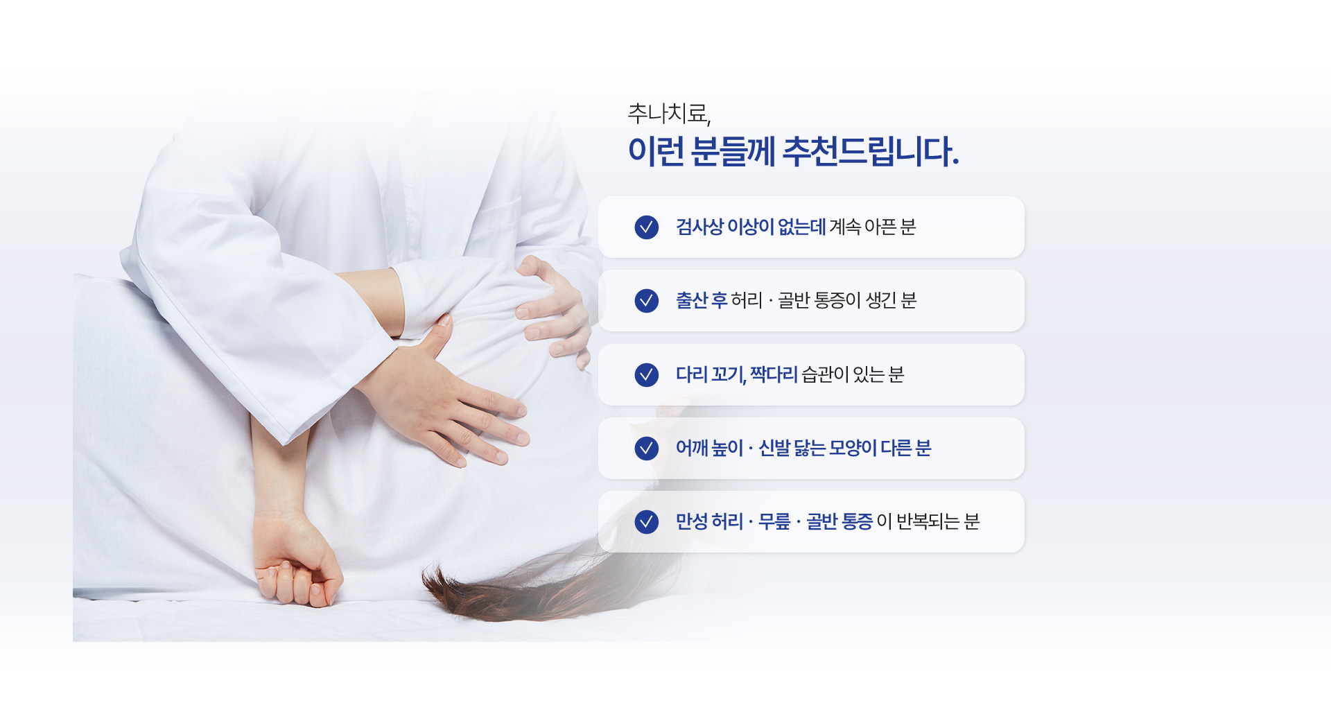 관절을 밀고 당기면서 신체 균형을 잡아 체내 기혈순환을 도와 몸상태를 정상으로 회복시킵니다.