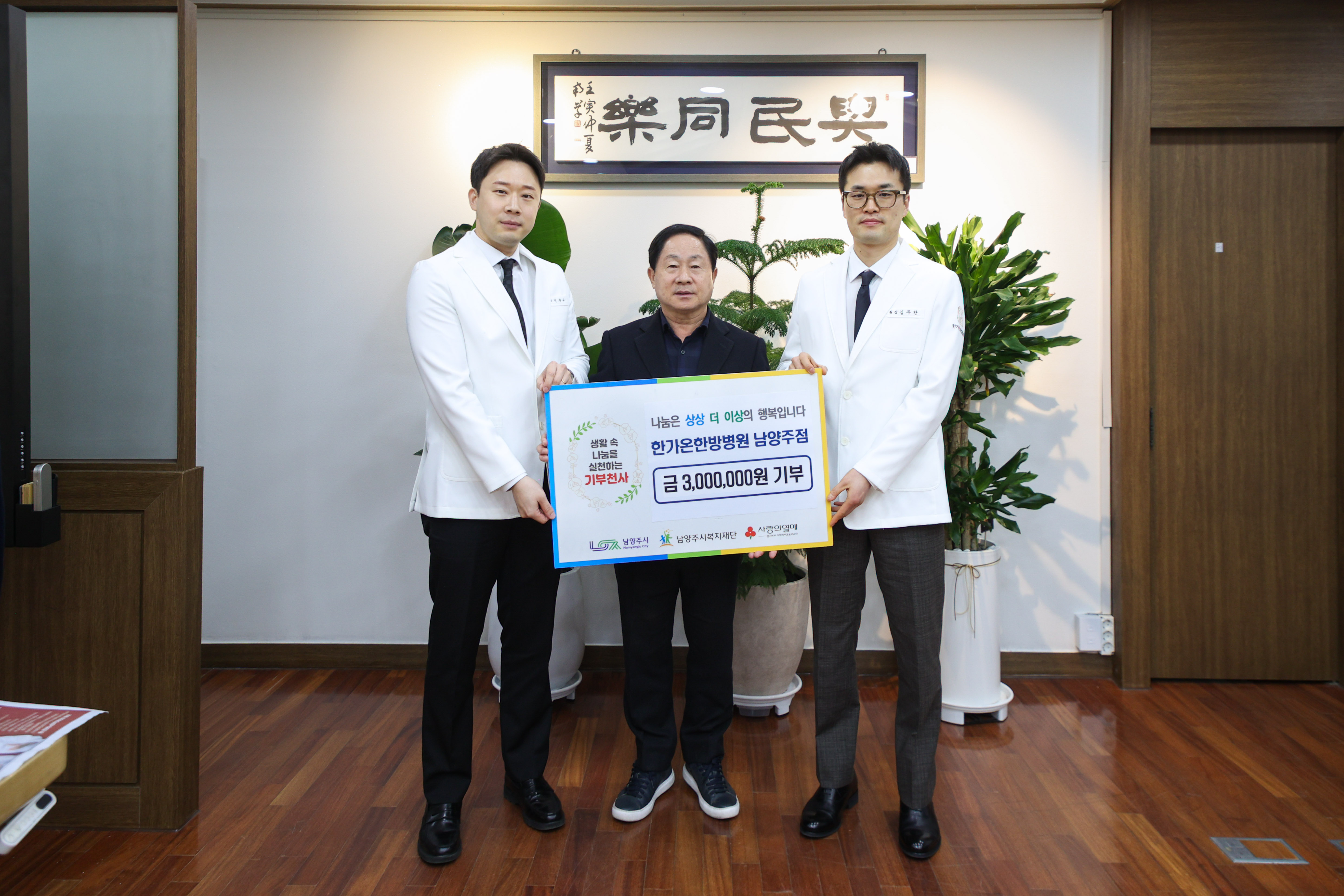 경기도 남양주시는 8일 호평동 한가온한방병원 남양주점이 지역 내 취약계층 지원을 위해 후원금 300만 원을 기탁했다고 밝혔다.